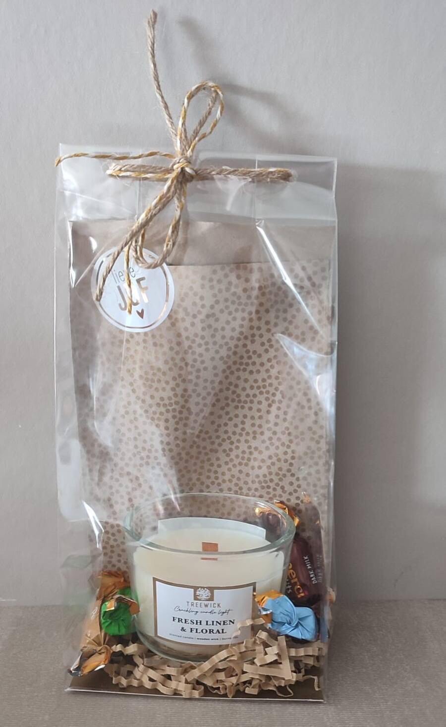 Leuk pakketje met een knisperkaars en chocolade om de juf te bedanken. Voorzien van een sticker 'lieve juf'.