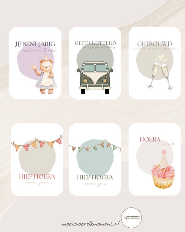 Dit set met 18 wenskaarten, blanco en met tekst en met speelse ronde hoeken. Ter waarde van € 16,20 nu voor € 10,95 per set.